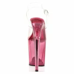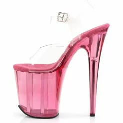 Transparent vinyl open toe ankle strap sandals with extra high pink tinted platform, stiletto heel and black microfiber insole.