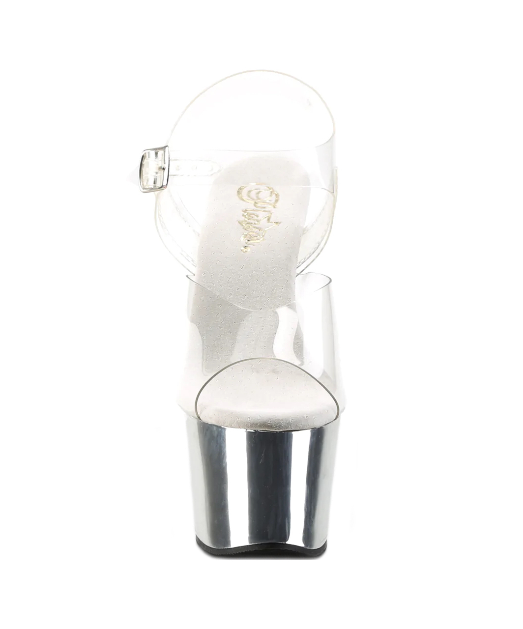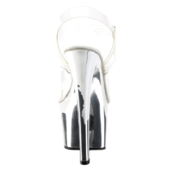 Transparent vinyl open toe ankle strap sandals with high silver chrome plated platform, stiletto heel and microfiber insole.