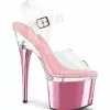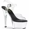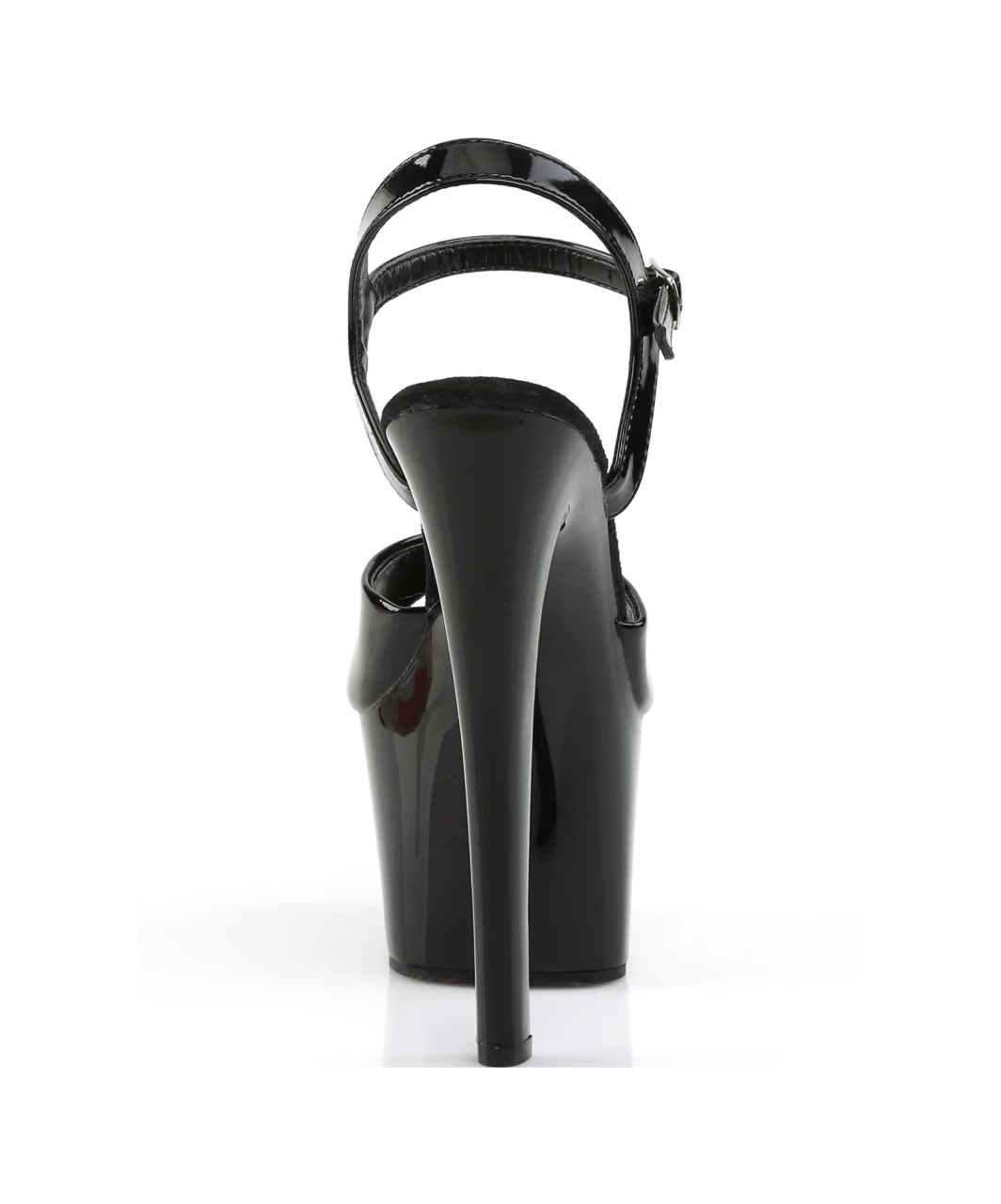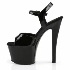 Black lacquered patent open toe ankle strap sandals with high platform, stiletto heel and microfiber insole.
