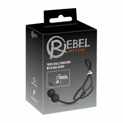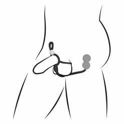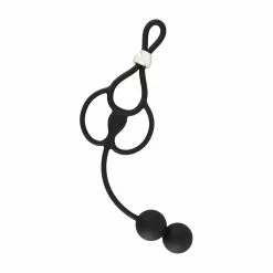 Silky smooth silicone black elastic cock and testicle rings connected by an elastic string with weighted anal balls. You can adjust the ring tightness. The perineal joint is stretchy (8-12 cm).