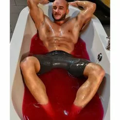 Fill the bathtub with warm water, approx. a third or 60 liters. Sprinkle one pack of Slube powder across the top of the water and mix with your hands. In a few minutes the bathtub will be full of smooth, slimy lubricant. If you want a thicker consistency, add more powder and vice versa – to make the Slube thinner add water. Once you’ve done your Slube play, add more water to dilute the lubricant and wash it down the drain.