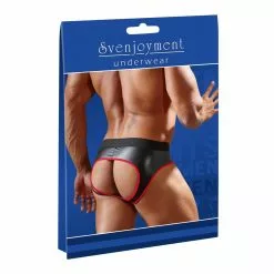 Black matte neoprene rubber look jock with a front zipper. Accentuated with a red edging.