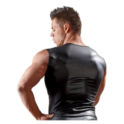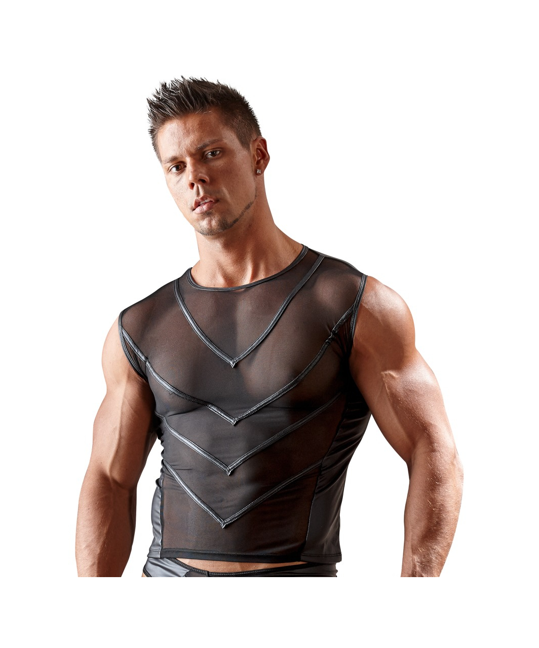 This black shirt with a fine matte gloss made out of thin, elastic material excites with powernet-insert and slim stitched stripes at the front. The narrow neckline perfectly completes the extravagant look. You will always look great in this figure-accentuating top – even the larger gentlemen!