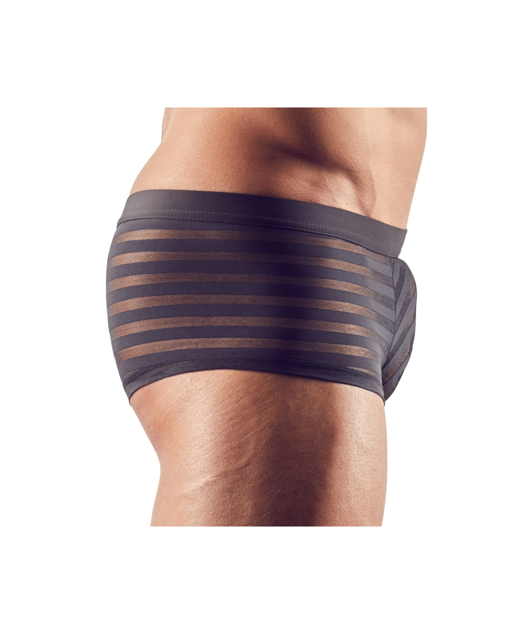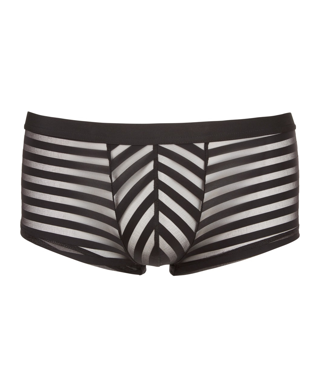 Black striped low-cut boxer briefs made of soft sheer fabric.
