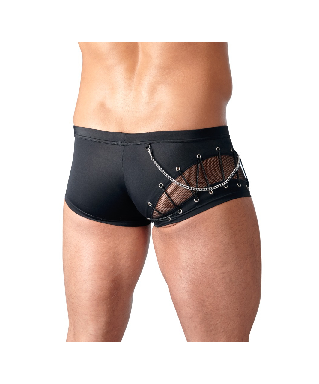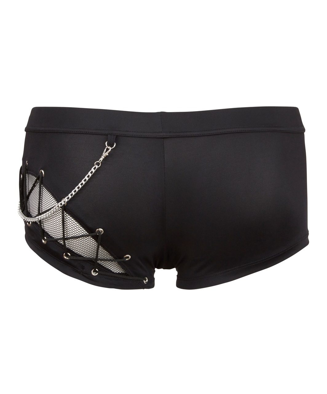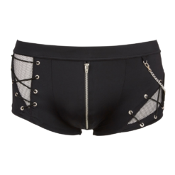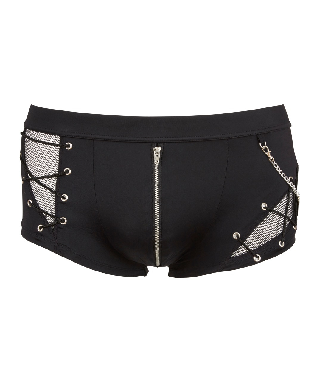 Black stretchy trunks made of a trendy combination of opaque and mesh. With a removable metal chain, decorative lacing and a zipper at the front.