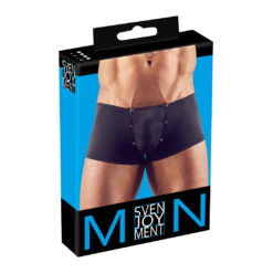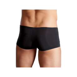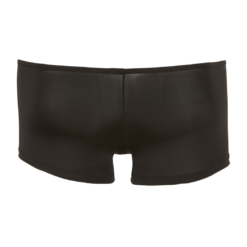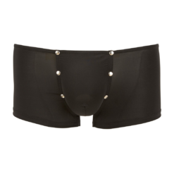 Black trunks with a pouch, press studs and a swell function hole for an impressive front bulge. Made of smooth, fine fabric – stretchy and slightly transparent.