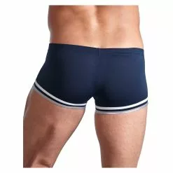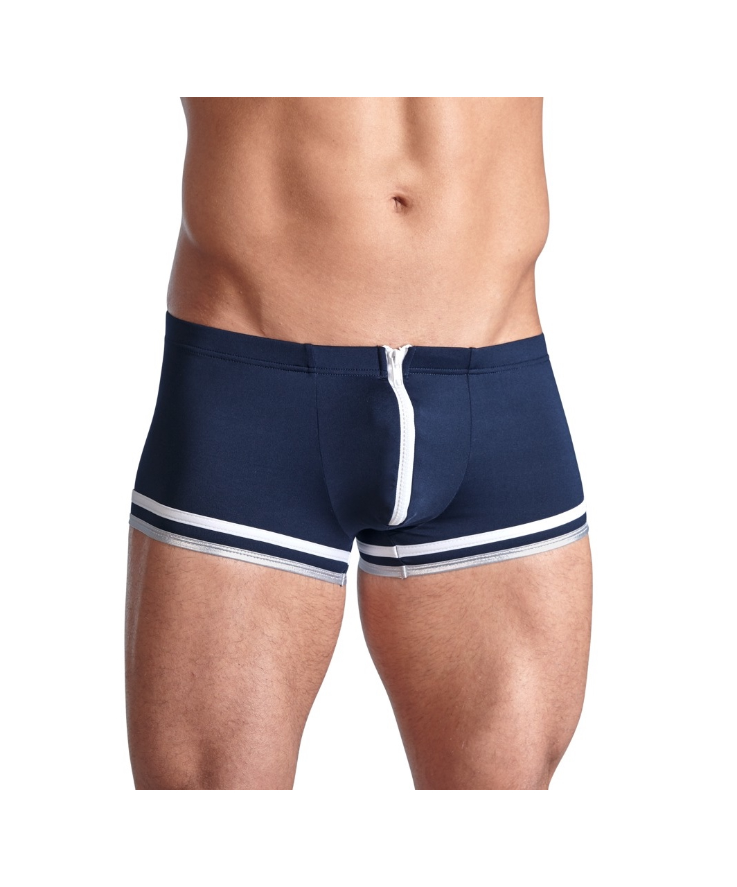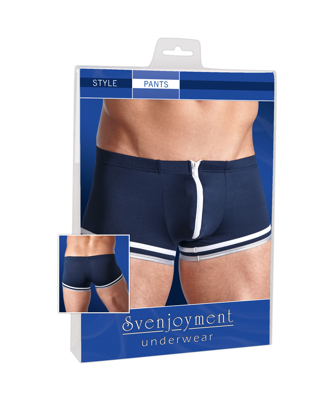 Blue sailor pants with white and silver-coloured stripes around the bottom of the legs. With a white, padded zip at the front. Soft microfibre.