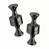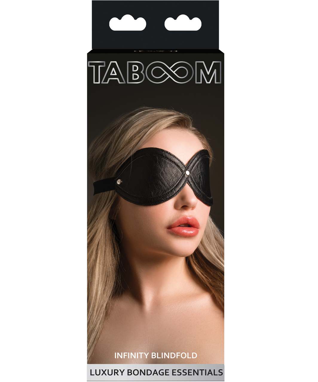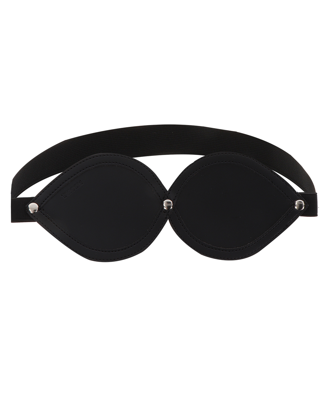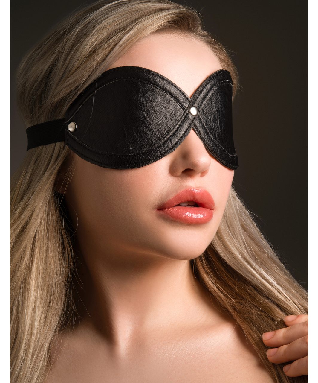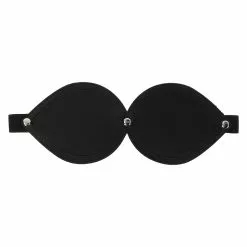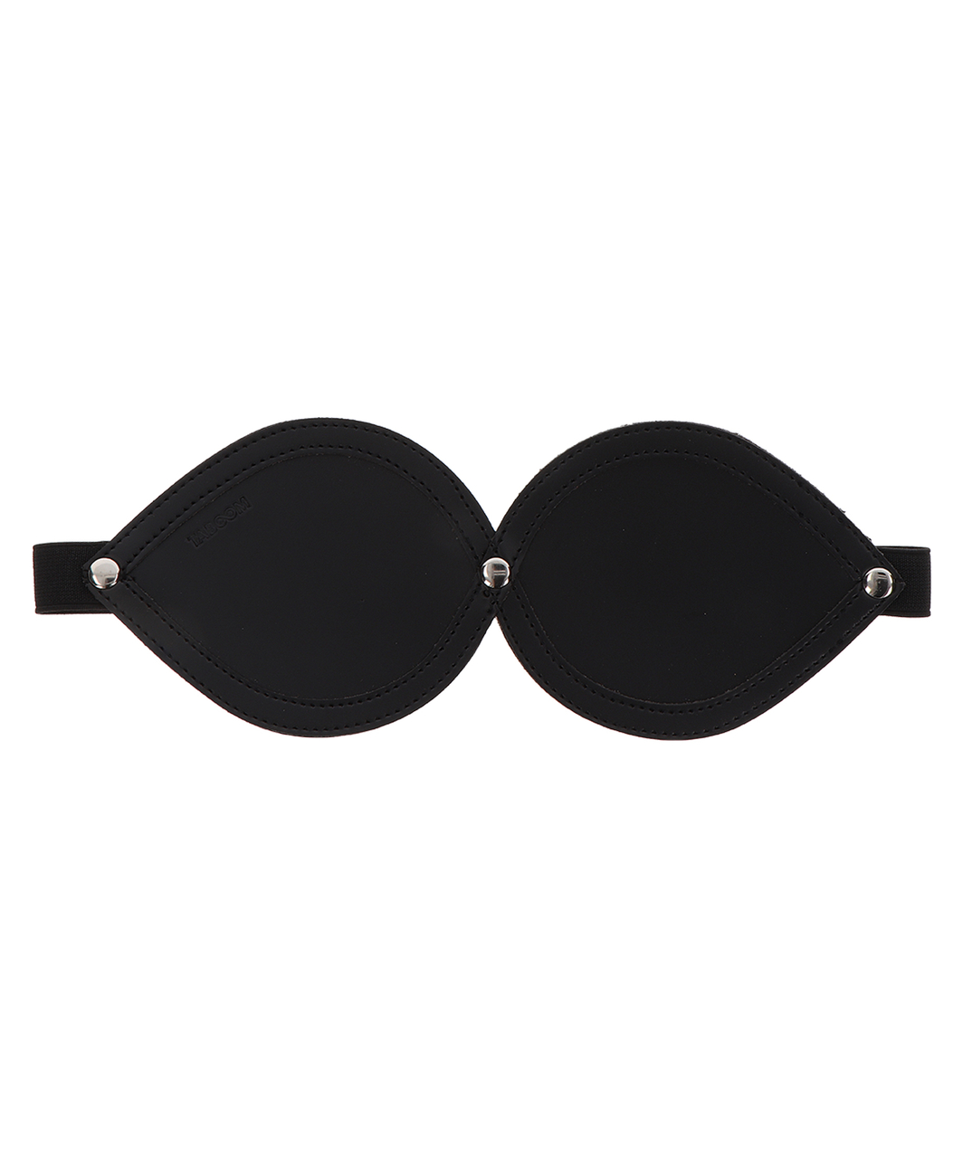 Black thick leatherette blindfold with a wide elastic band and metal studs. Covered in velvet on the inside.
