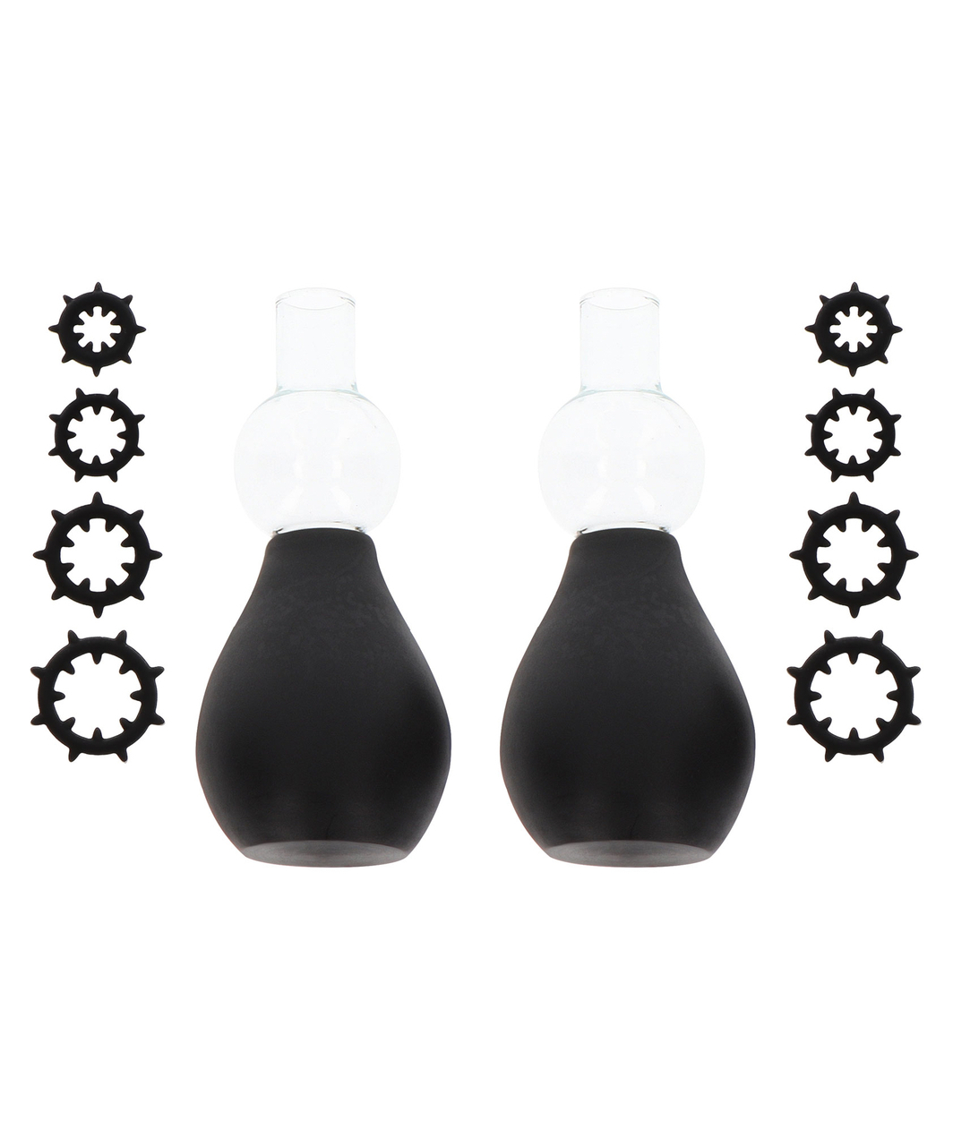 A pair of nipple pumps with four pairs of stimulation rings. Place the ring on the nipple and use the pump to inflate the nipple.