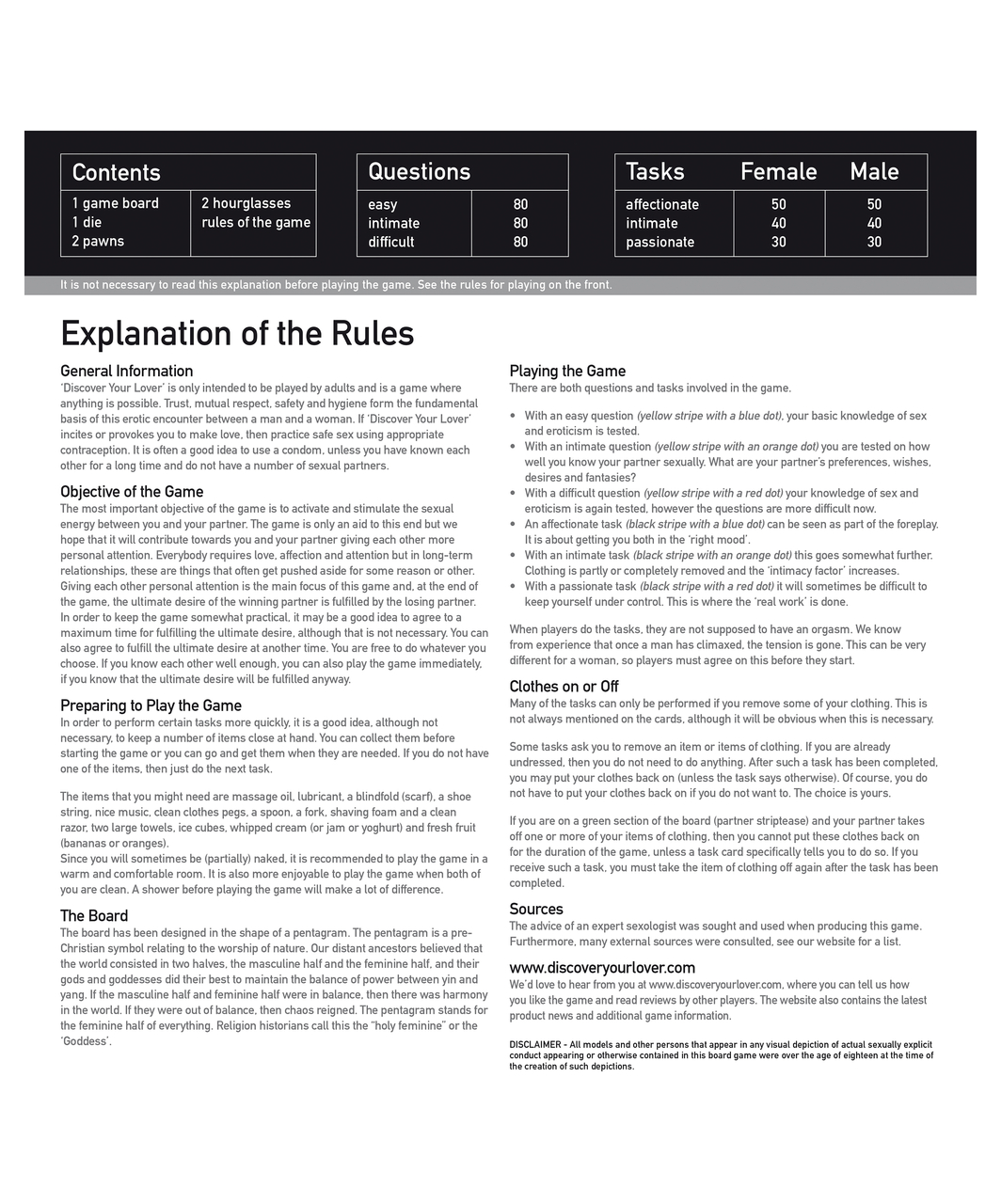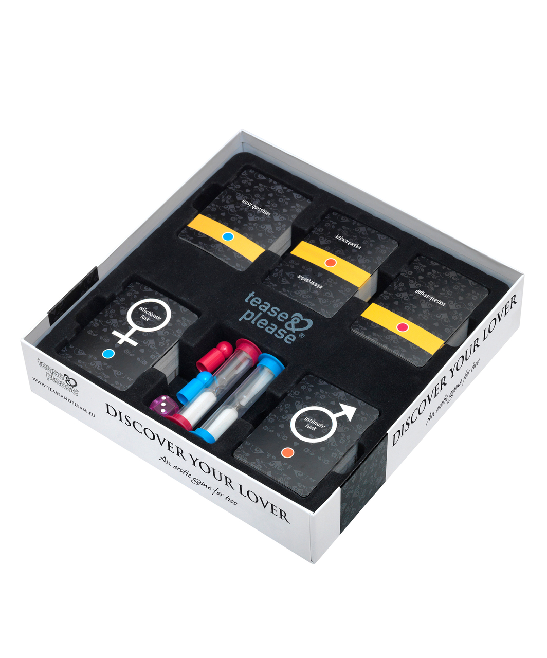 Discover Your Lover takes you on a sexual journey with your partner where enjoyment is essential. Using 480 questions and tasks, you and your partner will discover what the both of you really like. The game starts with affectionate, romantic tasks. The next level the game takes you to is the intimate level, things start to warm up now. Then towards the end of the game it’s time for the passionate challenges, with sparkling action where nothing is a must but anything is possible. In a playful way barriers are broken and you will feel closer then ever before. In this game everything can be played or adapted to your own liking.
