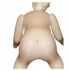 Life-sized inflatable kneeling love doll with three tight pleasure holes and voluptuous breasts with hard nipples. Imprinted blond hair and face.