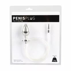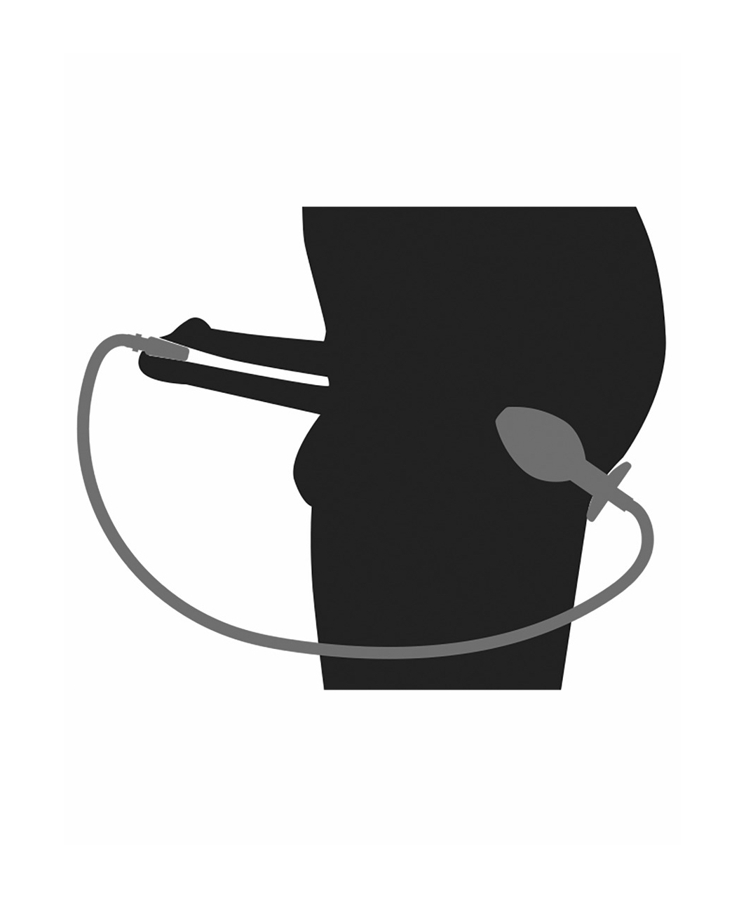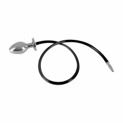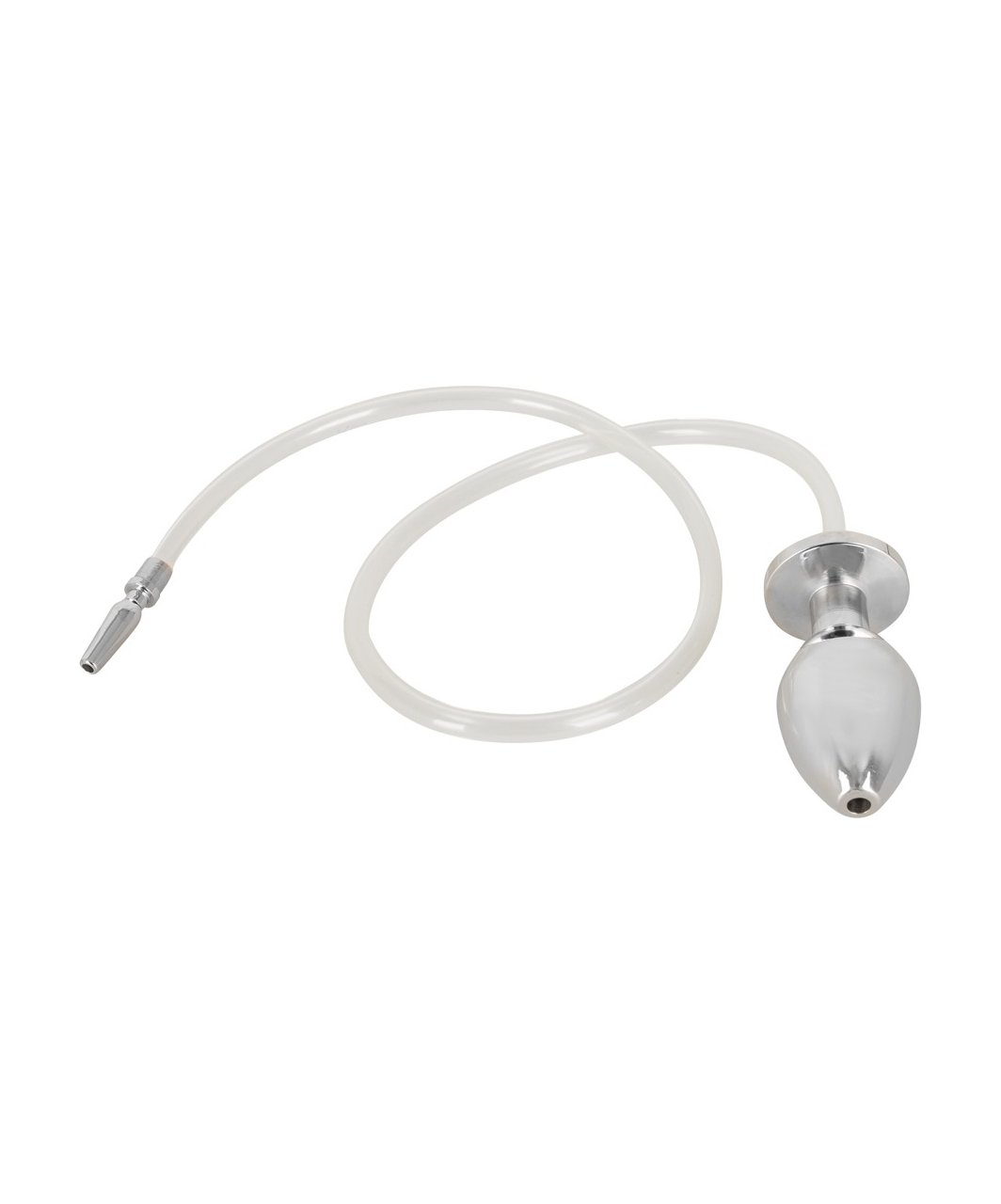 The hollow, heavy anal plug is connected to the open penis plug with a tube. Includes a black replacement tube.