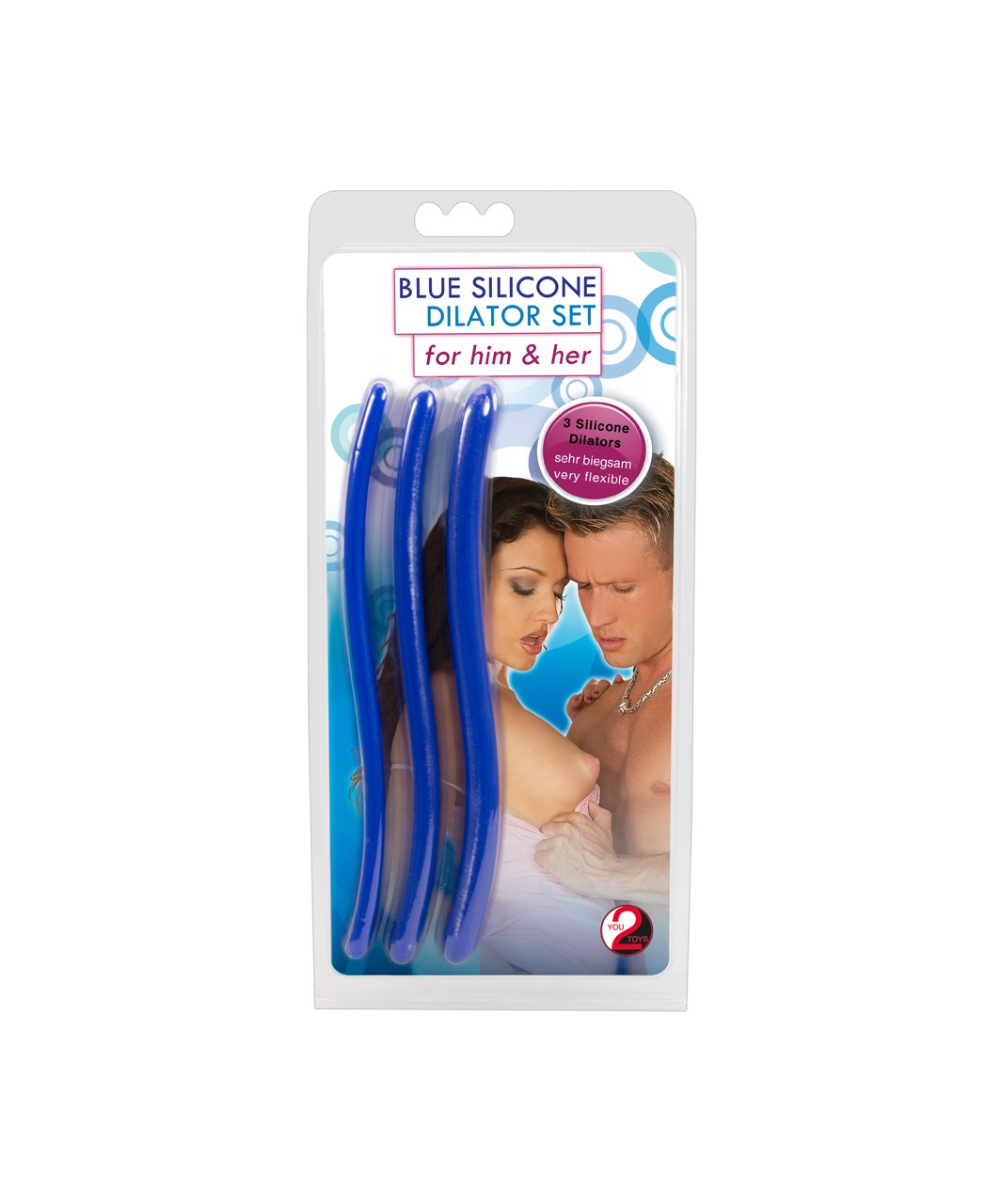 Set of blue, slightly bent and flexible dilators with seamless rounded tips, in different width.