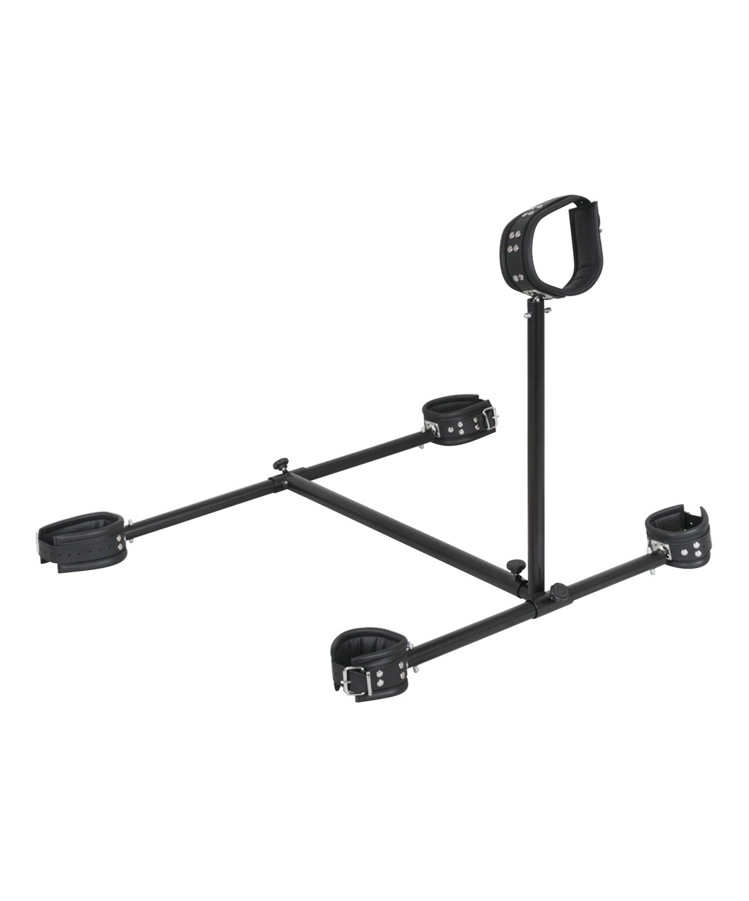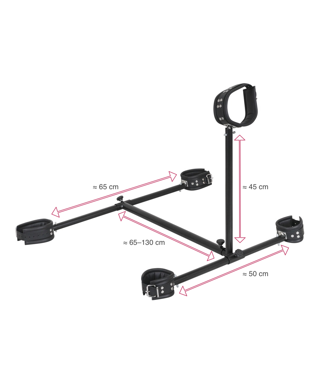 Floor pillory kit, complete with assembly equipment and two rests of different size for the bondage collar. With only little effort, the pillows is assembled disassembled in a jiffy: Simply attach the softly padded cuffs for neck, hands and ankles onto the metal frame. All cuffs are multiply adjustable by means of buckle closures. Black. Material: leather, metal.