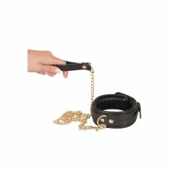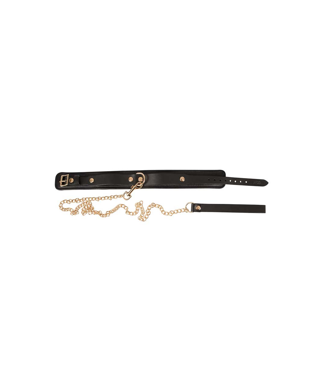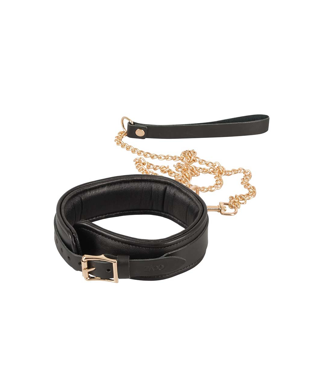 This collar is made out of extremely high-quality leather (chrome-free tanned). The collar is padded on the inside and fits comfortably around the neck. The leather’s beautiful look is emphasisied by the gold-coloured details on the buckle and the chain. The collar and leash are perfect for anyone who likes being extravagant.