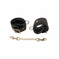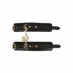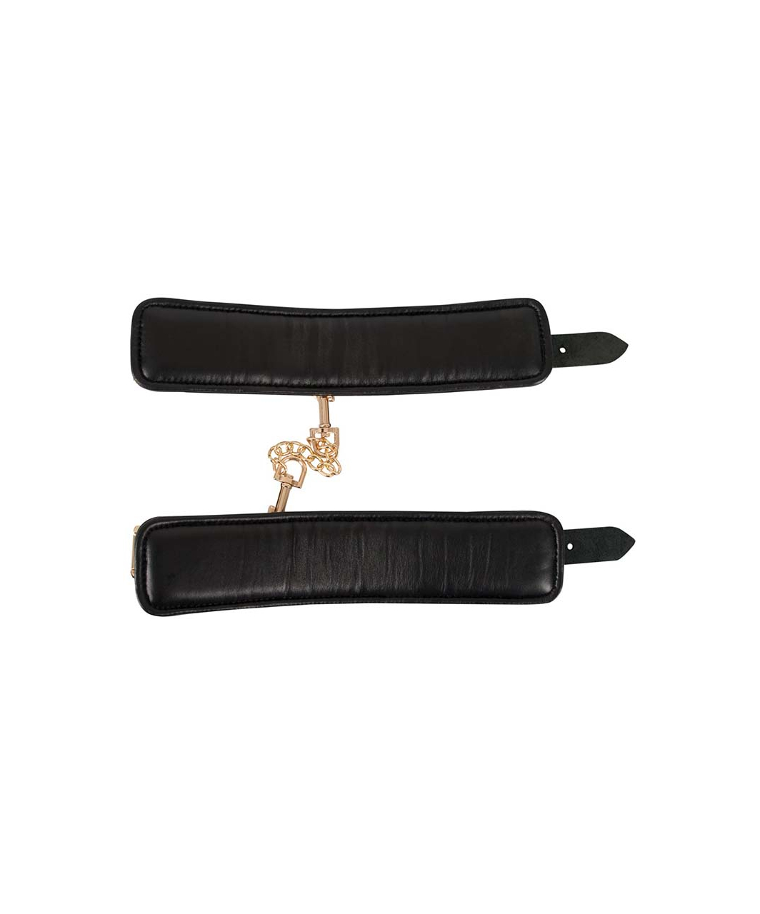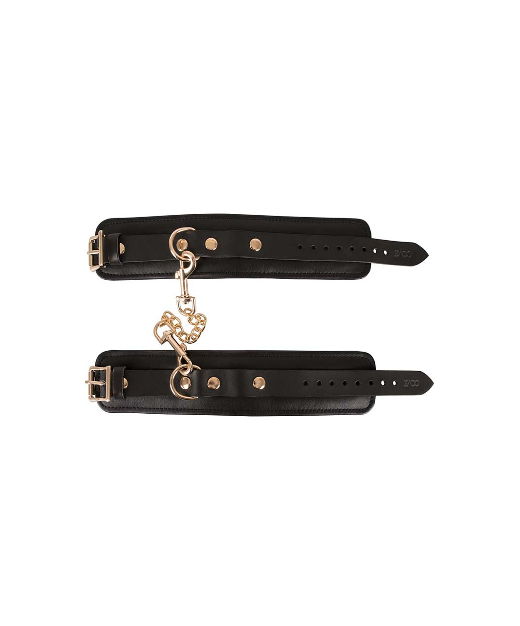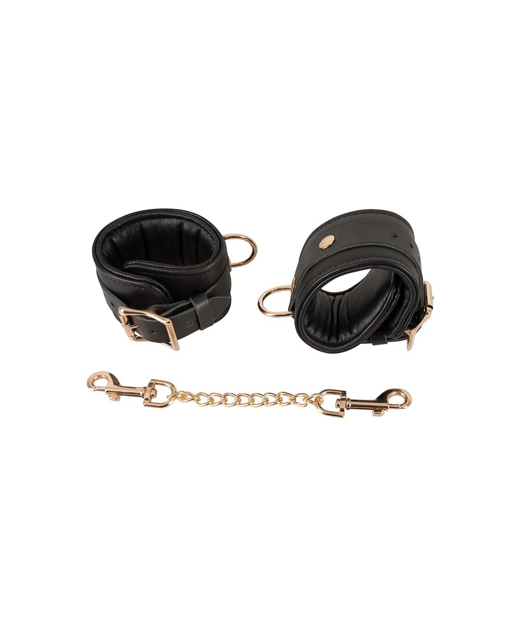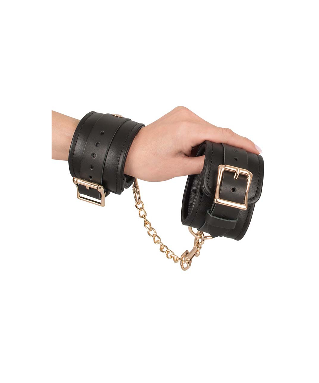 These handcuffs are made out of extremely high-quality leather (chrome-free tanned). They are padded on the inside and fit comfortably around the wrists. The leather’s beautiful look is emphasisied by the gold-coloured details on the buckles and the connection chain. The handcuffs are perfect for anyone who likes being extravagant.