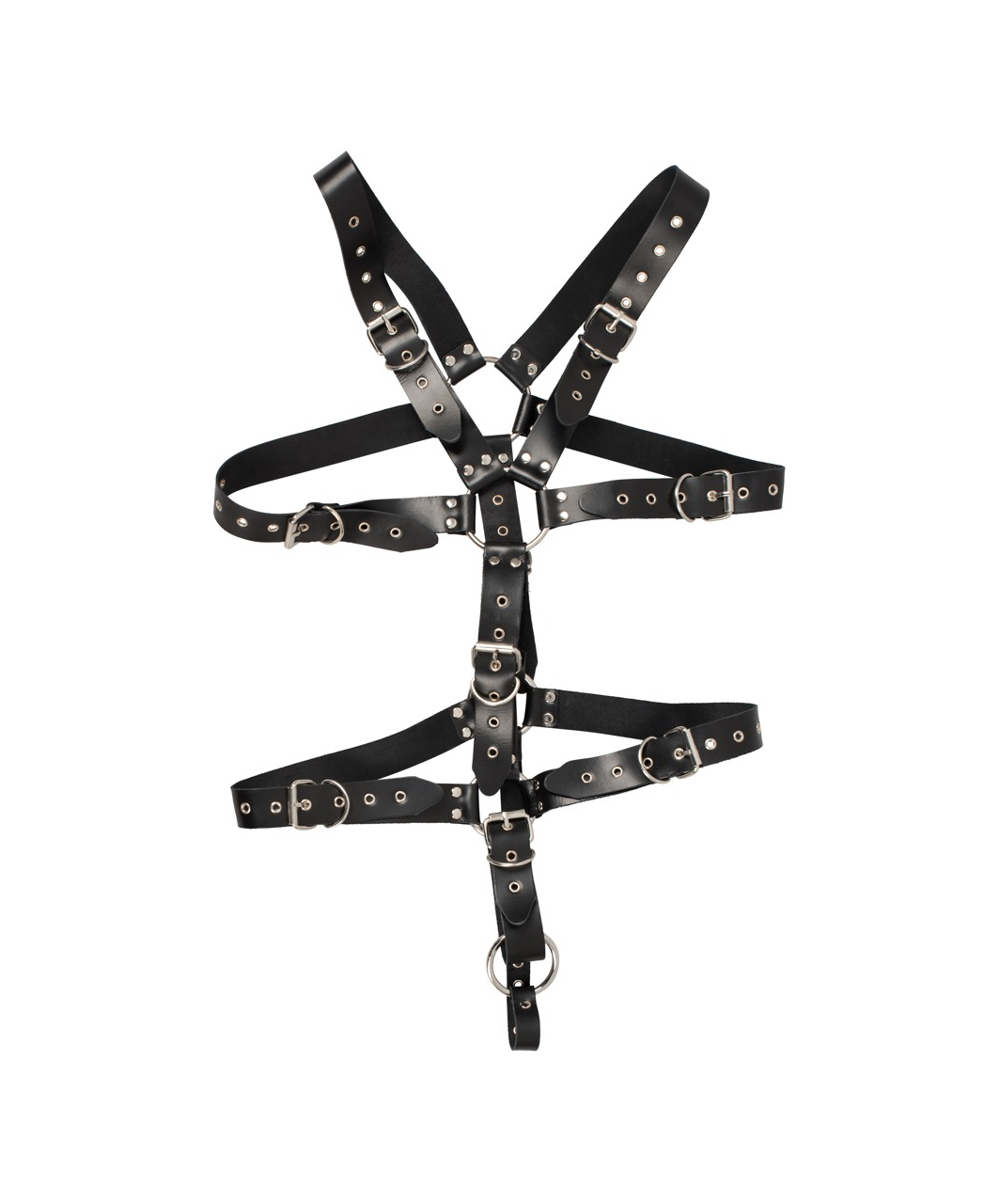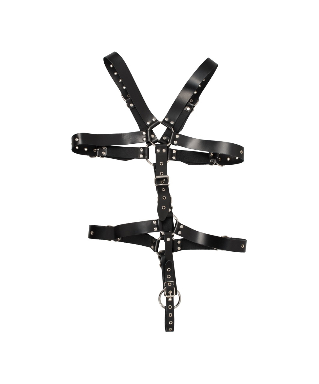 Leather body harness for him. Cock ring Ø 5 cm. Fully studded adjustable straps to fit all sizes. Unisize (S-L).