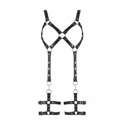 Adjustable leather strap body with metal buckles, leg straps with carabiners which can be used separately.