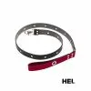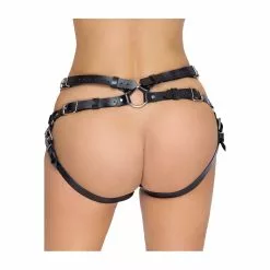 Black heavy-duty adjustable strap-on harness made of leather, with two interchangable metal rings as dildo holders. The waist and buttocks straps can be adjusted with belt buckles for a perfect fit. The straps holding the rings has a press stud closures.
