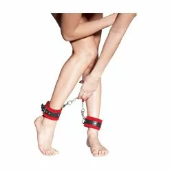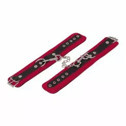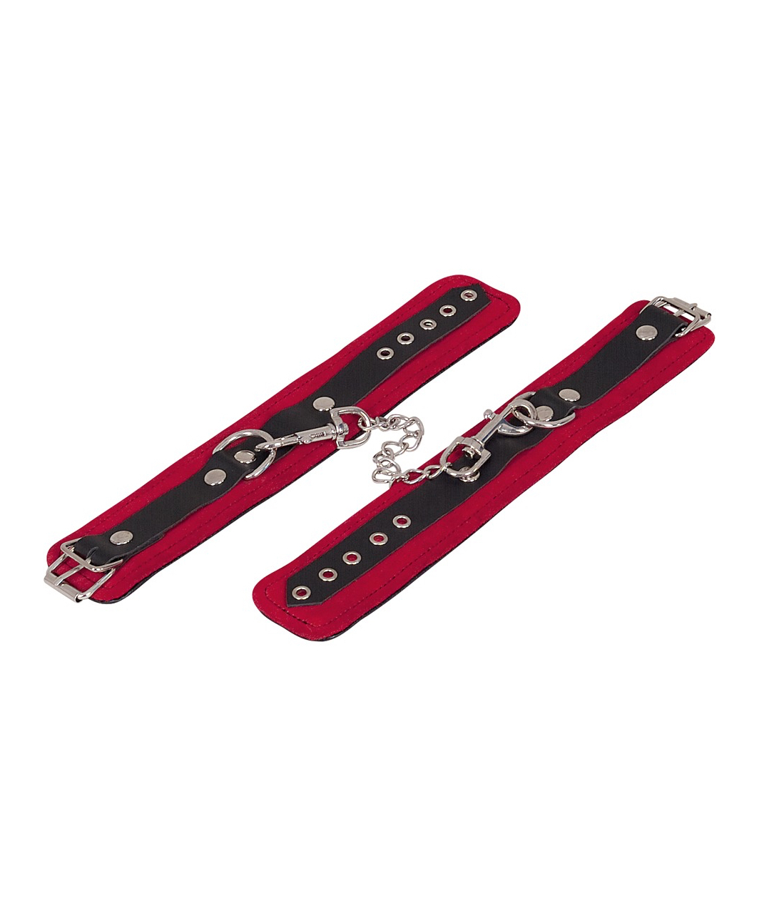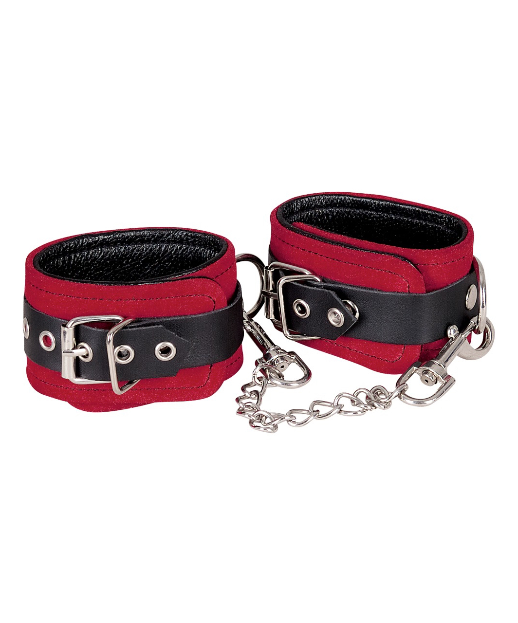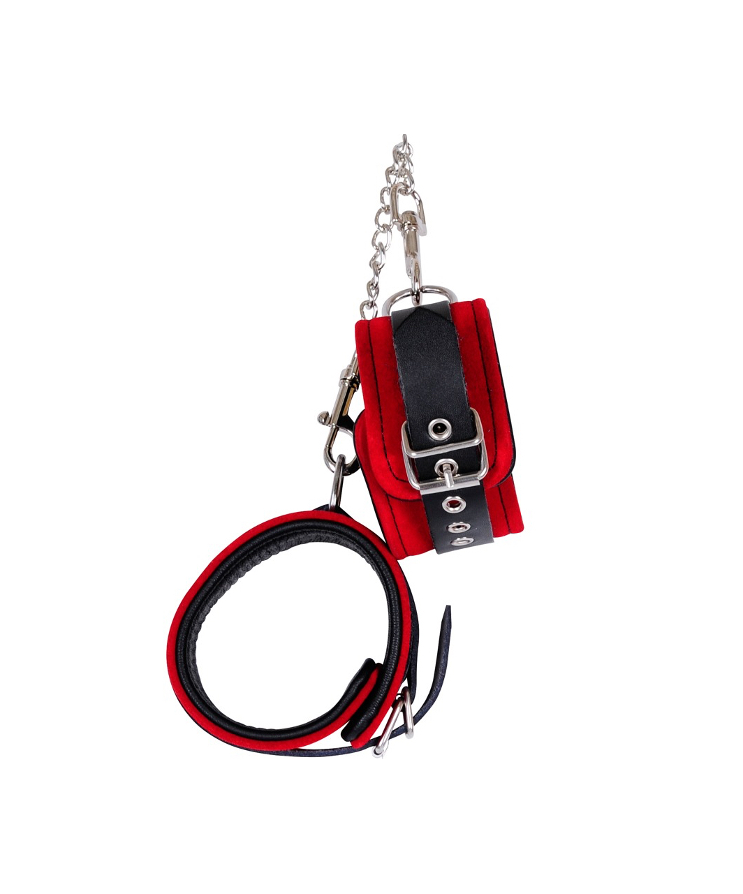 Two ankle cuffs made of red suede leather, softly padded with black smooth leather. Width each ca. 5.5 cm, adjustable in size due to buckle closures. On the D-rings with two snap hooks with a detachable connection chain with a length of 10 cm. Material: split leather/metal.
